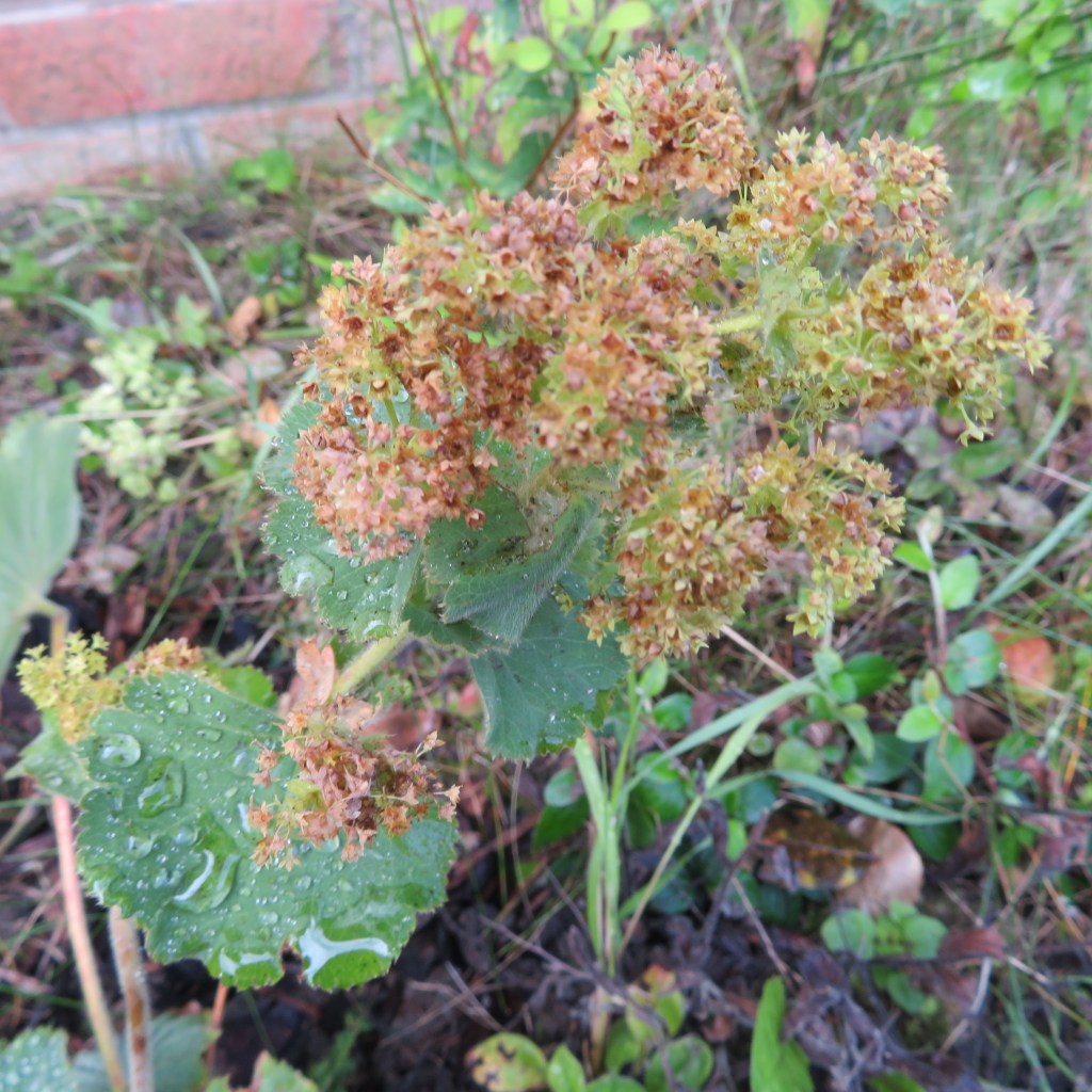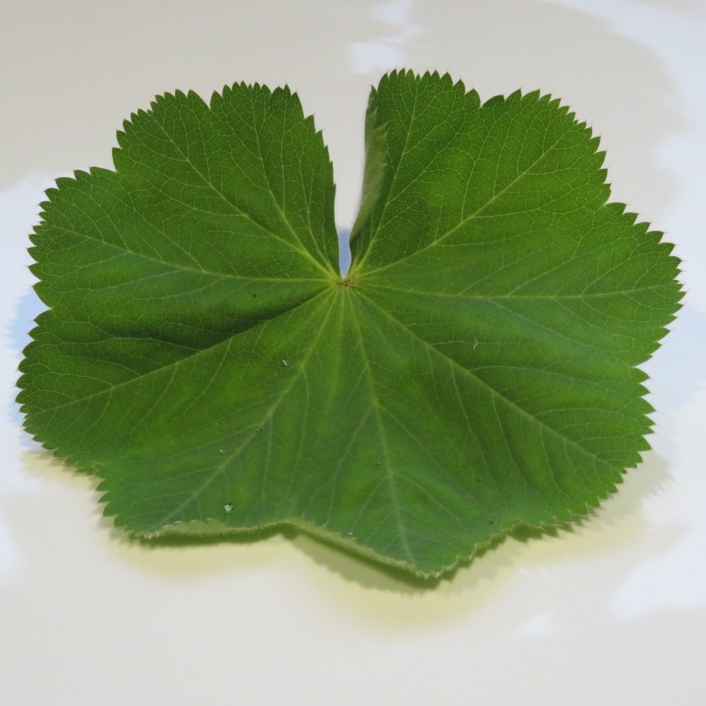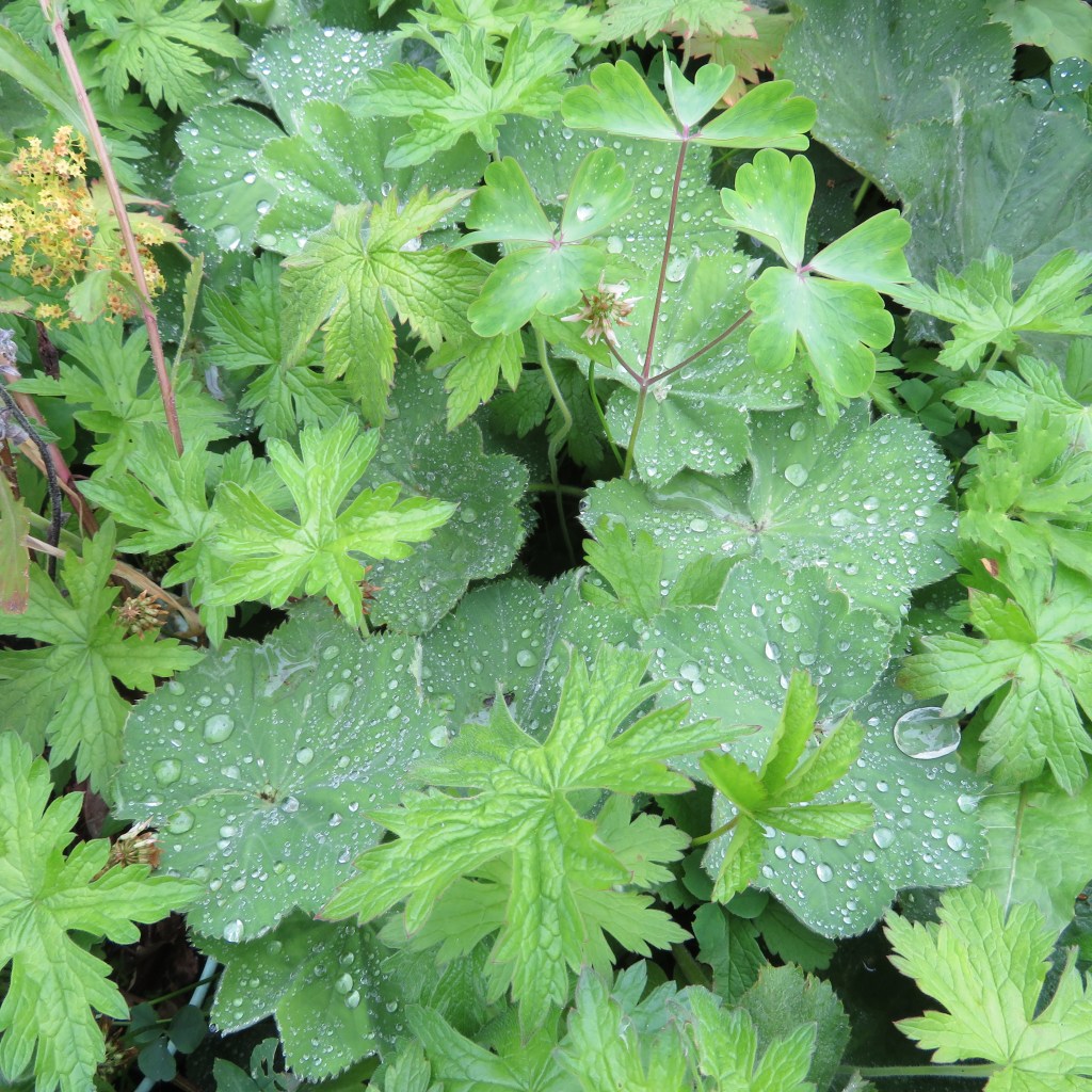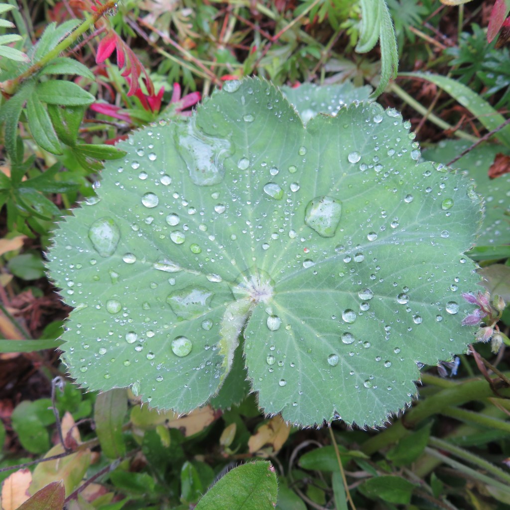 One species that grows well, some say too well, in British gardens, including mine, is Alchemilla mollis which fights for space with the equally wild perennial geraniums. Its beautiful leaf traps the rain with the tiny hairs on its surface (see Photos from my garden). The trapped raindrops are said by the ancient alchemists (hence the name Alchemilla for the plant) to be the purest form of water as a medium for their transmutations. Perhaps this trapping of the raindrops also earned the plant the name Lady’s Mantle.