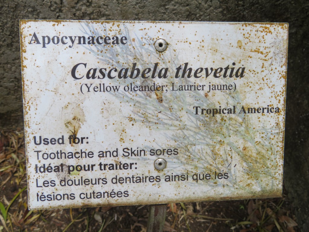 The label of the Cascabela thevetia in Pamplemousses suggested that it is ‘ideal for treating dental pain and some skin lesions’. All of these indications are of course part of folklore rather than scientifically validated. Beyond the shores of Mauritius, yellow oleander came to recent wider attention as an adulterant, substituent or additive in herbal slimming products, causing a number of poisonings, sufficiently severe for the US Food and Drug Administration and other health organisations to issue Health Alerts.