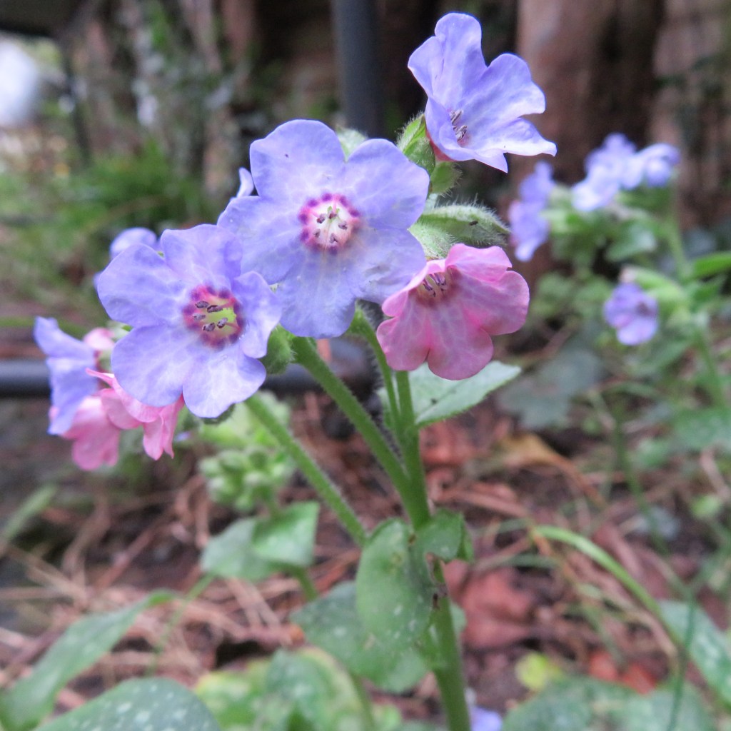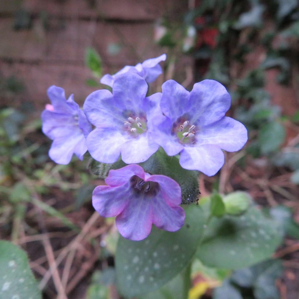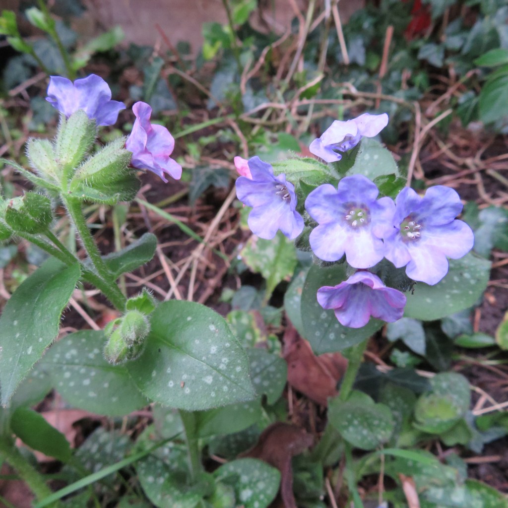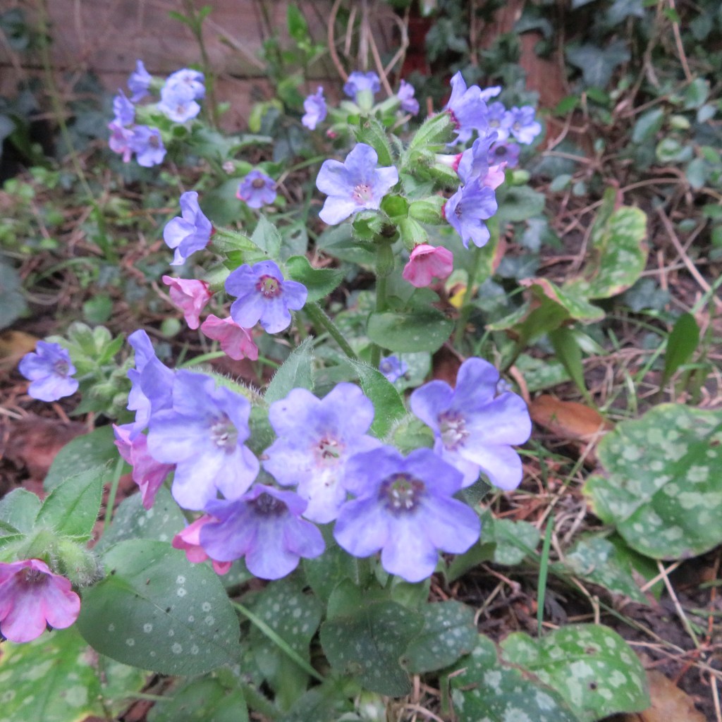 With a warm mid-February, spring is in the air in the English Midlands. The snowdrops are in full bloom and some other spring bulbs and a few camelias have followed. Walking around my soggy garden today (15 Feb), I came across a fine clump of lungwort in full bloom (see photos), hidden behind a garden bench.