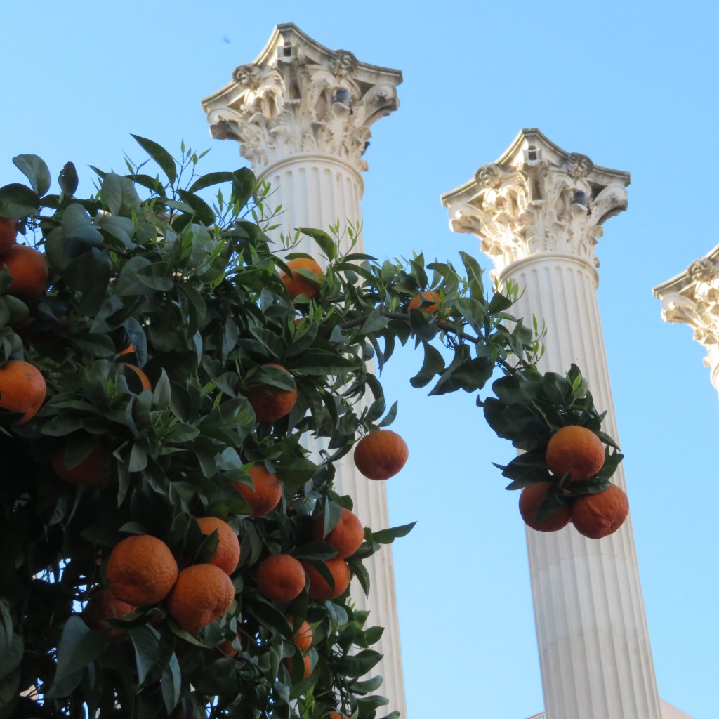 Photos and Credits – ALWP CEBP – The photos show windfall oranges I took home with me, an orange tree in full bloom, orange trees lining Calle San Francisco as they do along many such streets in Cordoba and Seville, Oranges trees against a backdrop of iconic sites in Cordoba (Alcazar de los Reyes Cristianos, Mezquita-Catedral, Plaza de las Tendillas, and Plaza Romano)